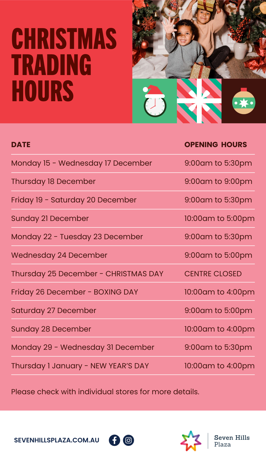 Seven Hills Plaza is open 7 days a week for your shopping convenience. Some retailers trade outside of standard centre trading hours and public holiday trading hours may vary. Please check with individual stores for specific trading times.